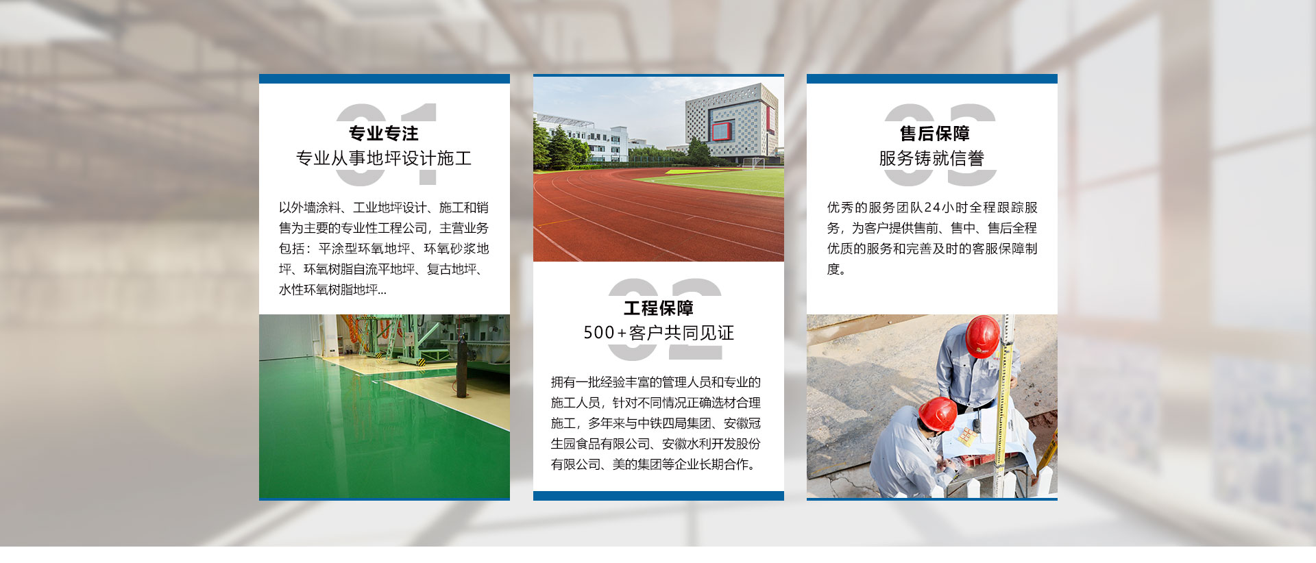 安徽世博裝飾工程有限公司成立于2009年,是一家以外墻涂料、工業(yè)地坪設(shè)計(jì)、施工和銷(xiāo)售為主要的專業(yè)性工程公司、是工業(yè)地坪施工的專業(yè)企業(yè)。公司設(shè)立了售后服務(wù)中心,用戶遍布全國(guó)大中小城市,一大批具有標(biāo)志性的長(zhǎng)期合作伙伴。“世博公司”環(huán)氧地坪工程,受到了越來(lái)越多的不同行業(yè)用戶的好評(píng)及青睞。公司擁有一批經(jīng)驗(yàn)豐富的管理人員和專業(yè)的施工人員,以保障產(chǎn)品的成功應(yīng)用,用較小的代價(jià)獲得理想的效果,尤其在地坪涂裝方面優(yōu)勢(shì)突出。而且以好的品質(zhì)管理模式,向客戶提供“獨(dú)具魅力”、“性能優(yōu)異”、“質(zhì)量穩(wěn)定”的產(chǎn)品。公司主要產(chǎn)品包括:平涂型環(huán)氧地坪、環(huán)氧砂漿地坪、環(huán)氧樹(shù)脂自流平地坪、滾涂型防靜電地坪、自流平防靜電地坪、復(fù)古地坪、水性環(huán)氧樹(shù)脂地坪、彩色透水混凝土地坪、壓花壓模藝術(shù)地坪、金剛砂耐磨硬化地坪、混凝土密封固化劑地坪、乙烯基酯重防腐地坪、GEP 標(biāo)準(zhǔn)型地坪、彈性PU運(yùn)動(dòng)場(chǎng)地坪、塑膠跑道地坪,PVC橡膠地板、停車(chē)場(chǎng)地坪、無(wú)震...